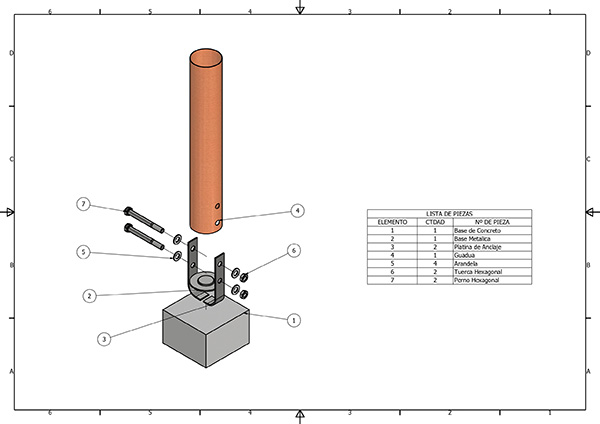 El sistema de anclaje inicia con la Base de Concreto, que sirve como cimiento y superficie de apoyo para el conjunto metálico. Sobre este cimiento se asienta la Base Metálica, la cual se asegura a la base de concreto mediante un par de Platinas de Anclaje.