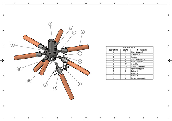 - Disco Soporte 5: Estos discos son la interfaz directa con la Guadua, asegurando la transferencia de esfuerzos.
