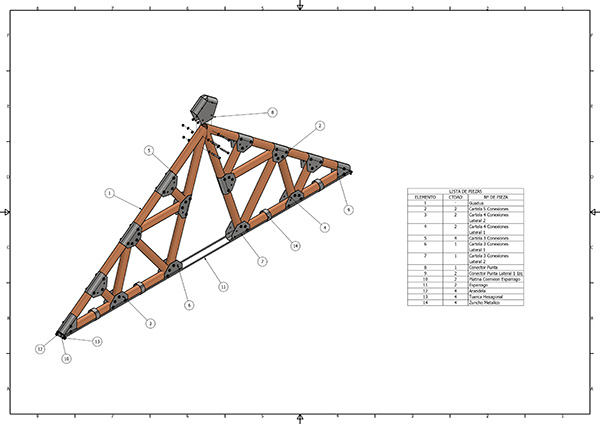 El ensamble está compuesto por la estructura principal de Guadua y un conjunto variado de Nodos y elementos de fijación: